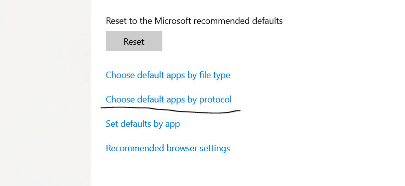 Scroll to the bottom of the window and look for the default app by protocol option.